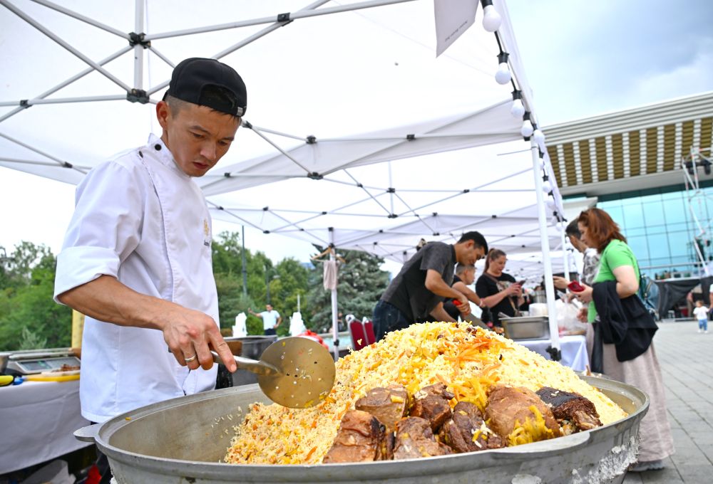2024年8月24日,在哈薩克斯坦阿拉木圖美食節上,廚師製作手抓飯。新華社發(阿拉木圖市旅遊局供圖)