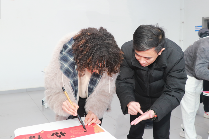 春聯是楹聯的一種。楹聯習俗在2006年被列入中國第一批國家級非物質文化遺產代表性項目名錄。在千百年的歷史傳衍過程中,楹聯與中國古典詩、詞、賦等文體互相影響、一脈相承,形式日益多樣,文化積澱逐漸豐厚。老師詳細地講解了春聯的平仄對仗規則、內容表達和應用。“真是太有魅力了!春聯不僅在音律上要對應,內容上也要對應,每一副春聯中都藴含着豐富的文化內涵。”鄧潔感嘆到,“這種中國獨有的文學形式,讓我對中國人的精神風貌和價值追求有了更加深刻的認識。”