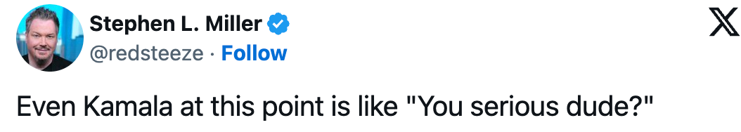 英國《旁觀者》週刊特約編輯斯蒂芬·米勒評論道,“就連卡瑪拉(哈里斯)此時也會説‘你是認真的嗎?’”↓