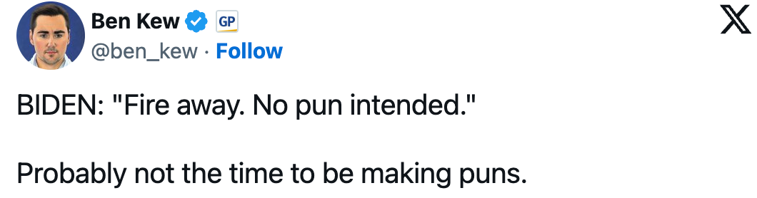 美國保守派作家本·基尤評論説,“現在可能不是玩雙關語的時候。”↓