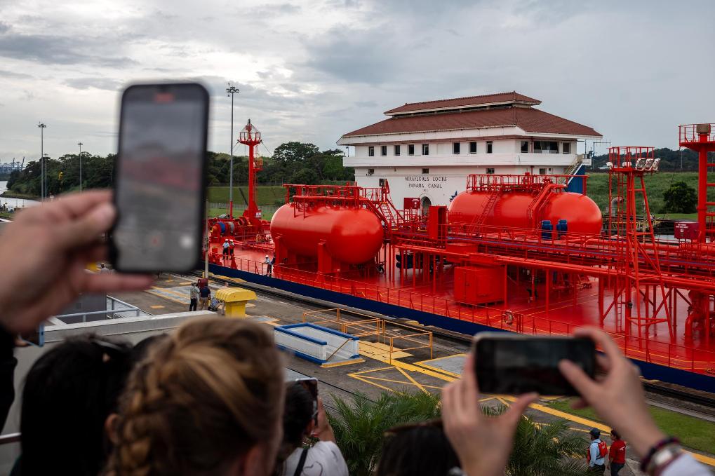 2024年12月31日,在巴拿馬首都巴拿馬城附近,遊客在巴拿馬運河的米拉弗洛雷斯船閘遊客中心觀看輪船通過船閘駛入太平洋。新華社記者李木子攝