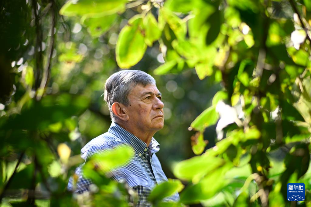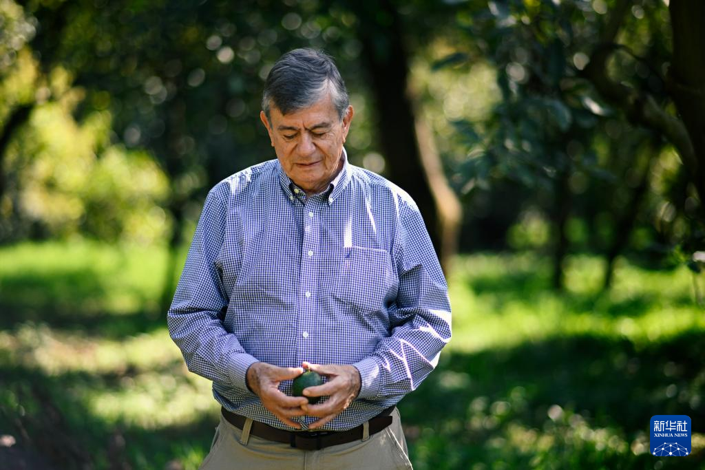 12月6日,在墨西哥米卻肯州烏魯阿潘市,農場主恩裏克·包蒂斯塔站在牛油果樹叢中。新華社記者 李木子 攝