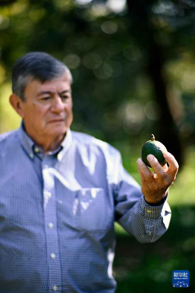 12月6日,在墨西哥米卻肯州烏魯阿潘市,農場主恩裏克·包蒂斯塔注視着手中的一顆牛油果。新華社記者 李木子 攝