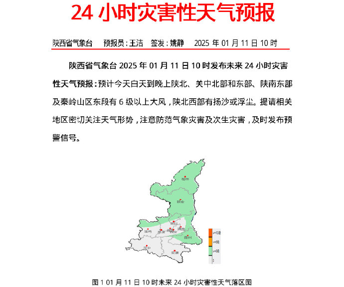 陝西省氣象台今天(1月11日)10時發佈未來24小時災害性天氣預報:預計今天白天到晚上陝北、關中北部和東部、陝南東部及秦嶺山區東段有6級以上大風,陝北西部有揚沙或浮塵。