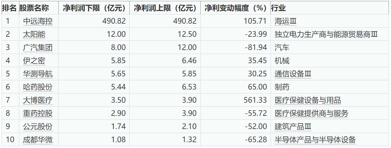 從預告淨利潤金額來看,10家公司預計全年淨利潤超1億元。其中,中遠海控、太陽能、廣汽集團排名居前,預計淨利潤分別為490.82億元、12.00億元、8.00億元。