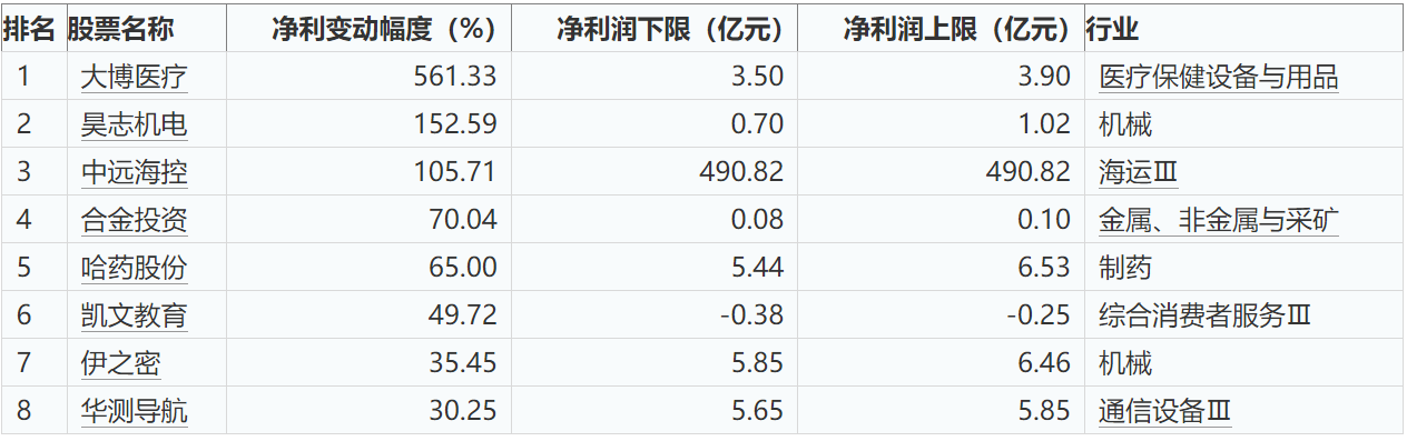 從預告淨利潤增幅來看,5家公司預計全年淨利潤增幅超50%。其中,大博醫療、昊志機電、中遠海控排名居前,預計淨利潤增幅分別為561.33%、152.59%、105.71%。