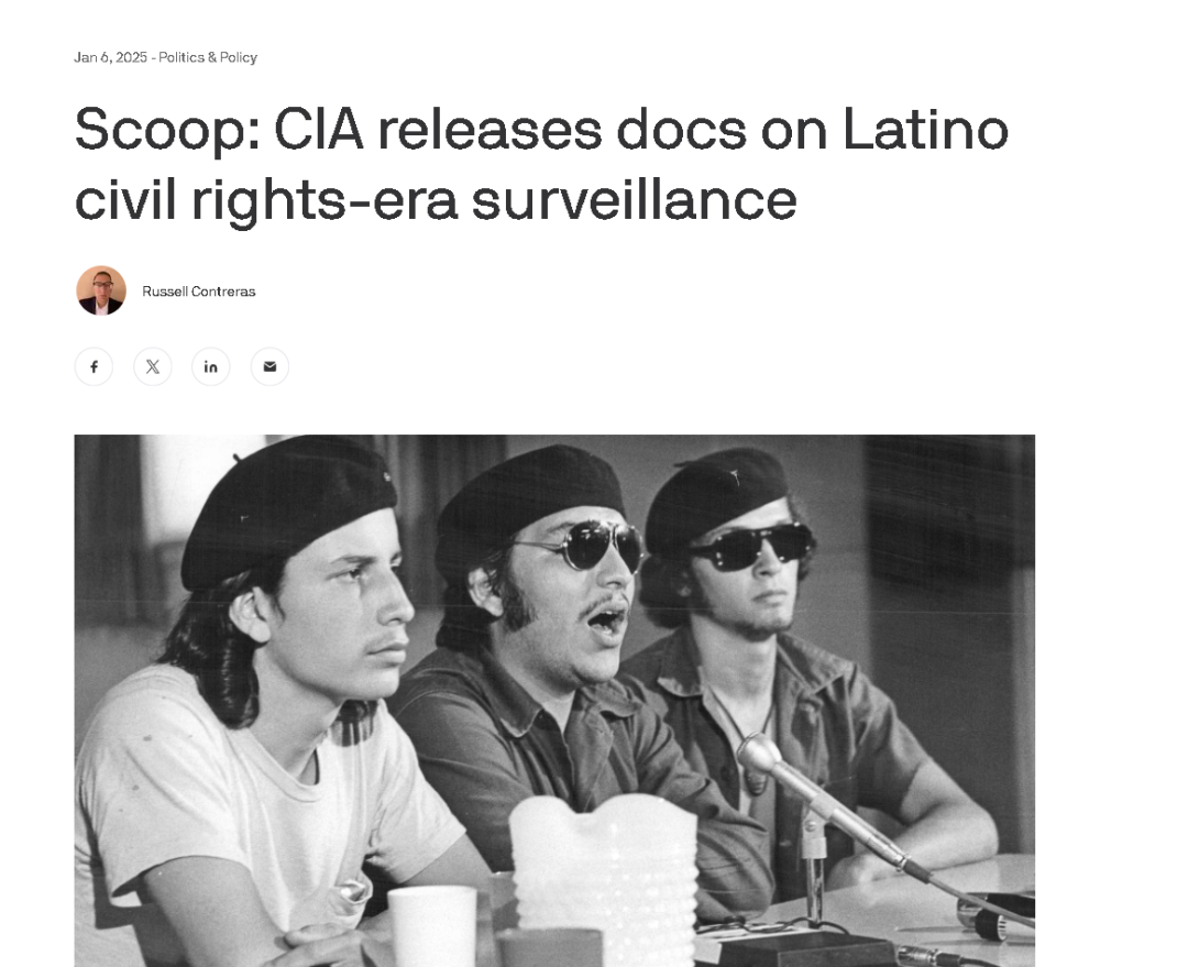 據美國媒體Axios披露,美國中央情報局(CIA)最近公開了一批引人關注的文件。這批文件顯示,中情局曾在1968年到1983年間,對美國國內知名的拉丁裔民權運動人士進行了長達15年的監視。