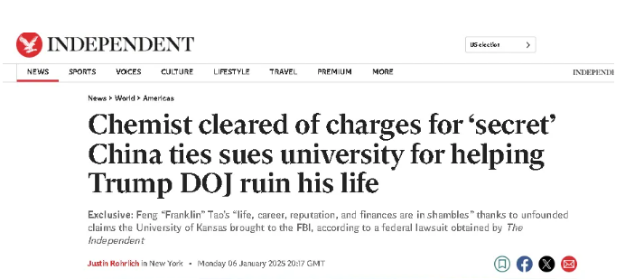 而且“巧合”的是,根據英國《獨立報》對其中一位“中國行動計劃”受害者陶豐的報道,在這位美國堪薩斯大學的教授蒙冤後,他的大學也在主動幫美國聯邦調查局去找他的黑材料……