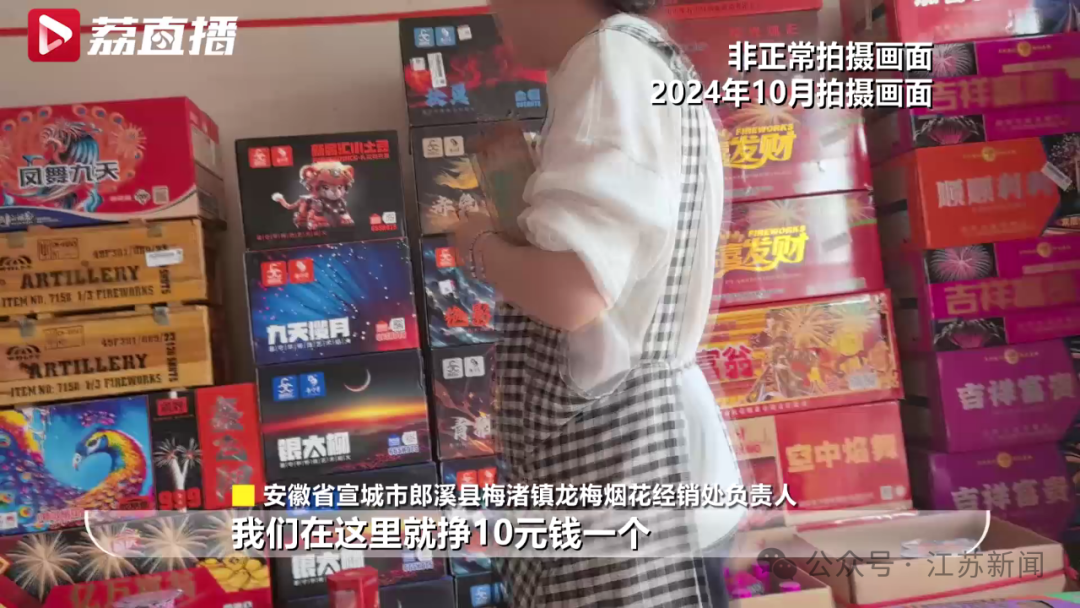 安徽省宣城市郎溪縣梅渚鎮龍梅煙花經銷處負責人:“便宜點的這個110元一個,我掌握不了你們怎麼賣,我們在這裏就掙10元錢一個,浙江那邊翻兩倍賣,上海那邊翻三倍賣。”