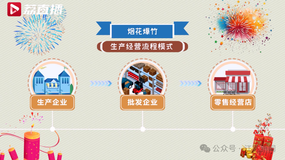 根據相關規定,煙花爆竹的生產經營流程是:生產企業——批發企業——零售經營店。
