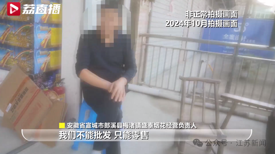 安徽省宣城市郎溪縣梅渚鎮盛泰煙花經營負責人:“這邊有一家有批發資質,你不要講多少家有資質,我們都是零售證,批發證特別難弄,按照規矩講我們就不能批發只能零售。”
