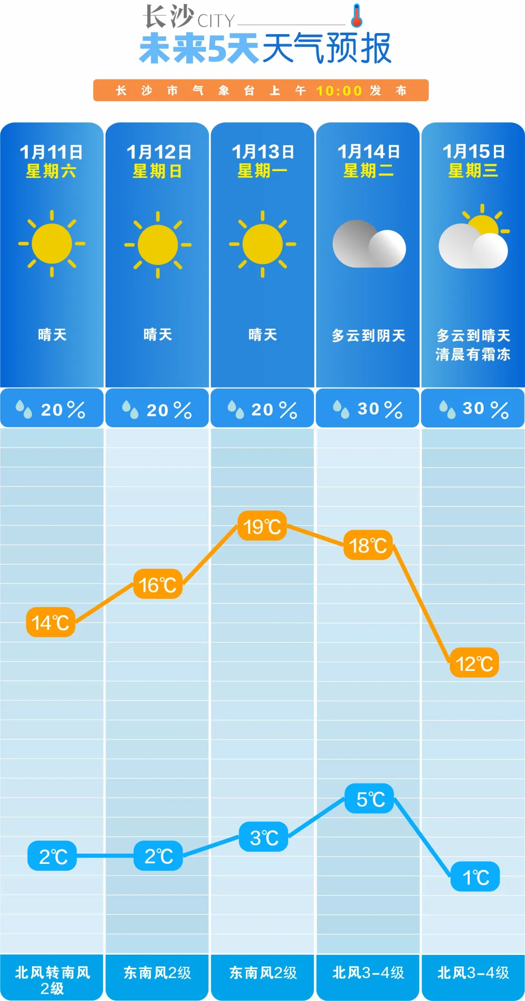今天至19日降水總體偏少,氣温偏高,晝夜温差大。其中14日省內部分地區有分散性小雨,其他時段以晴天間多雲為主,白天最高氣温可升至18~20℃,受晴空輻射降温影響,11日至13日、16日至18日清晨最低氣温-2~0℃。