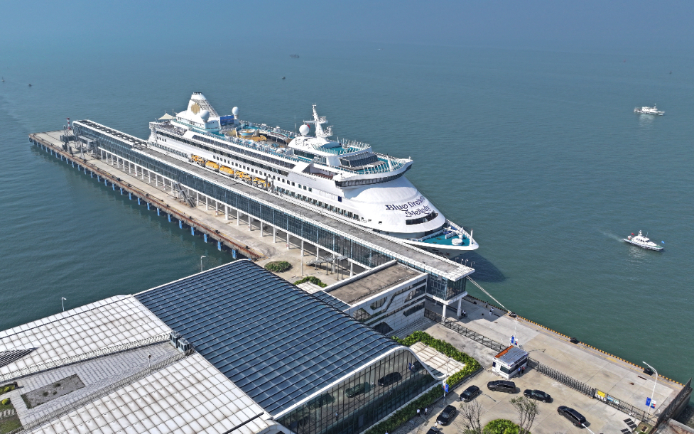 圖為2024年11月15日在北部灣國際郵輪母港拍攝的即將執行首航任務的“藍夢之歌”號郵輪。新華社發(無人機照片,周華攝)。