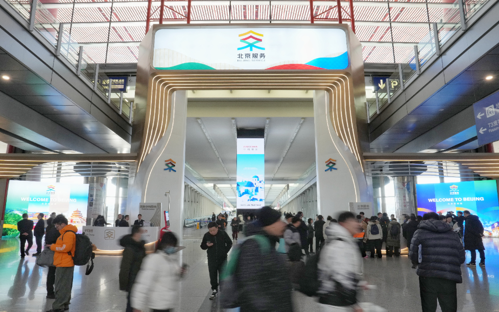 圖為2025年1月8日,在北京首都國際機場T3航站樓拍攝的“北京服務”機場服務點。從1月1日起,北京在首都國際機場和大興國際機場的國際到達出口設立“北京服務”機場服務點,為來華、來京外籍人士提供金融、通訊、交通、文旅等四個主題的20餘項高頻服務,便利八方來客暢遊中國。新華社發 (鞠煥宗攝)