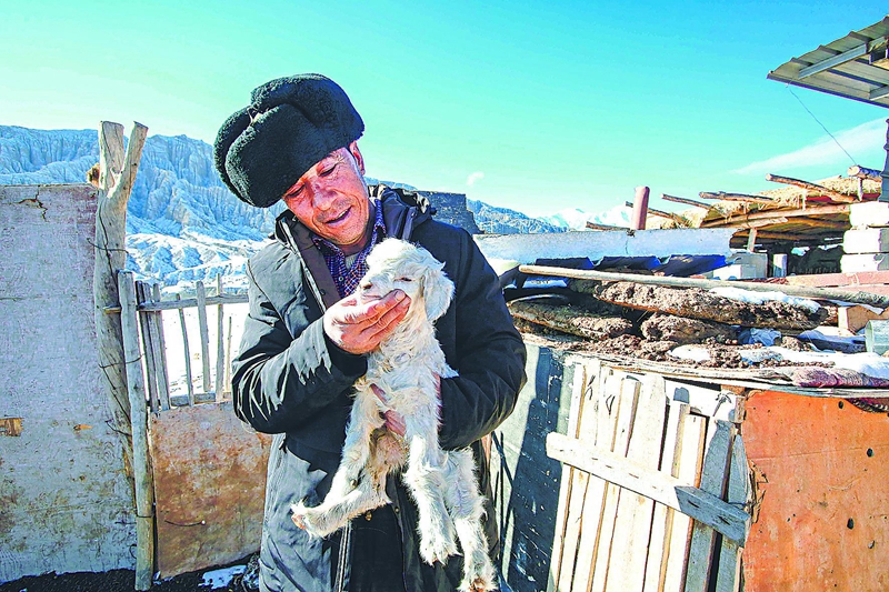 1月7日,烏什縣亞曼蘇柯爾克孜族鄉別迭裏山口牧業點,肉孜·薩迪克在查看小羊生長情況。