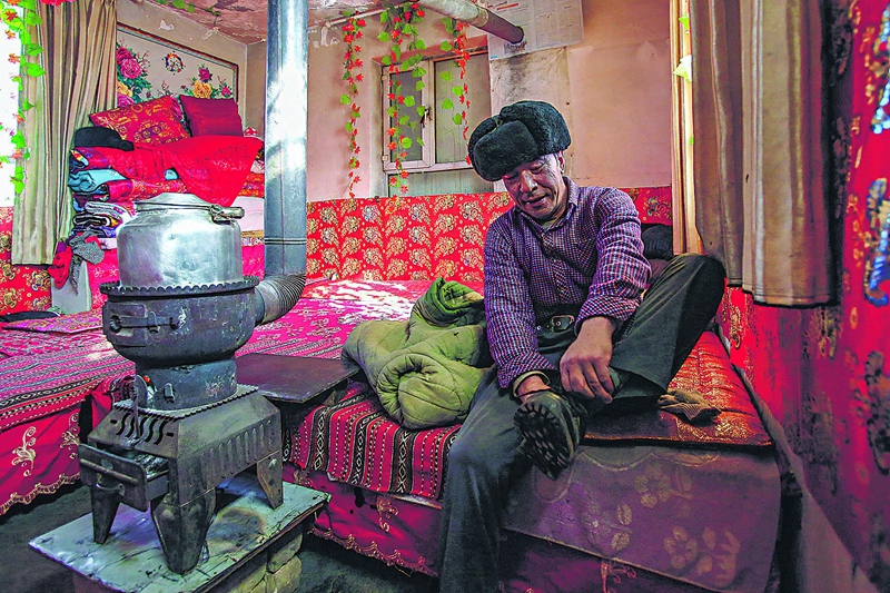1月7日,烏什縣亞曼蘇柯爾克孜族鄉別迭裏山口牧業點,肉孜·薩迪克準備外出。