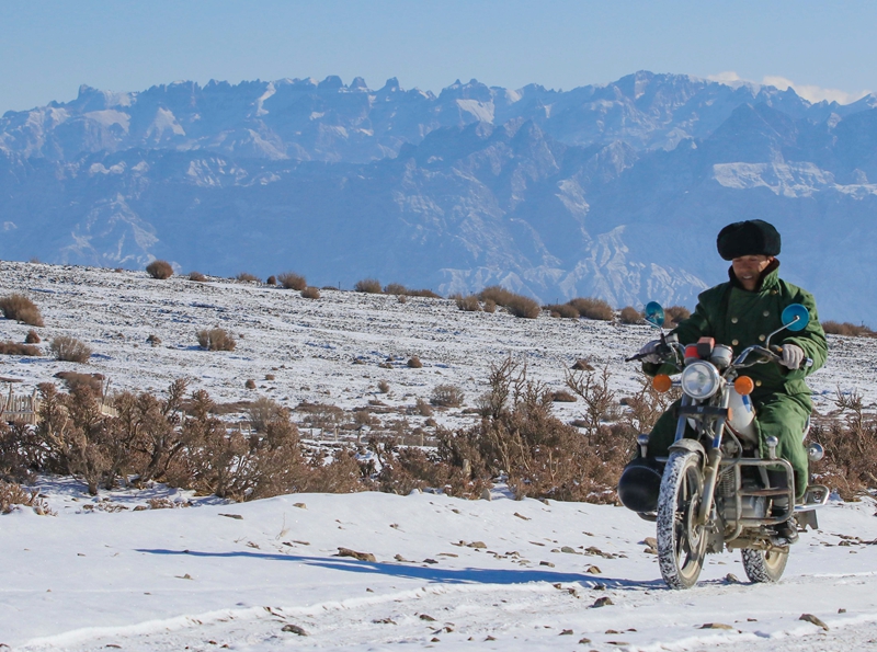 1月7日,肉孜·薩迪克騎着摩托車在烏什縣亞曼蘇柯爾克孜族鄉別迭裏山谷巡邏。
