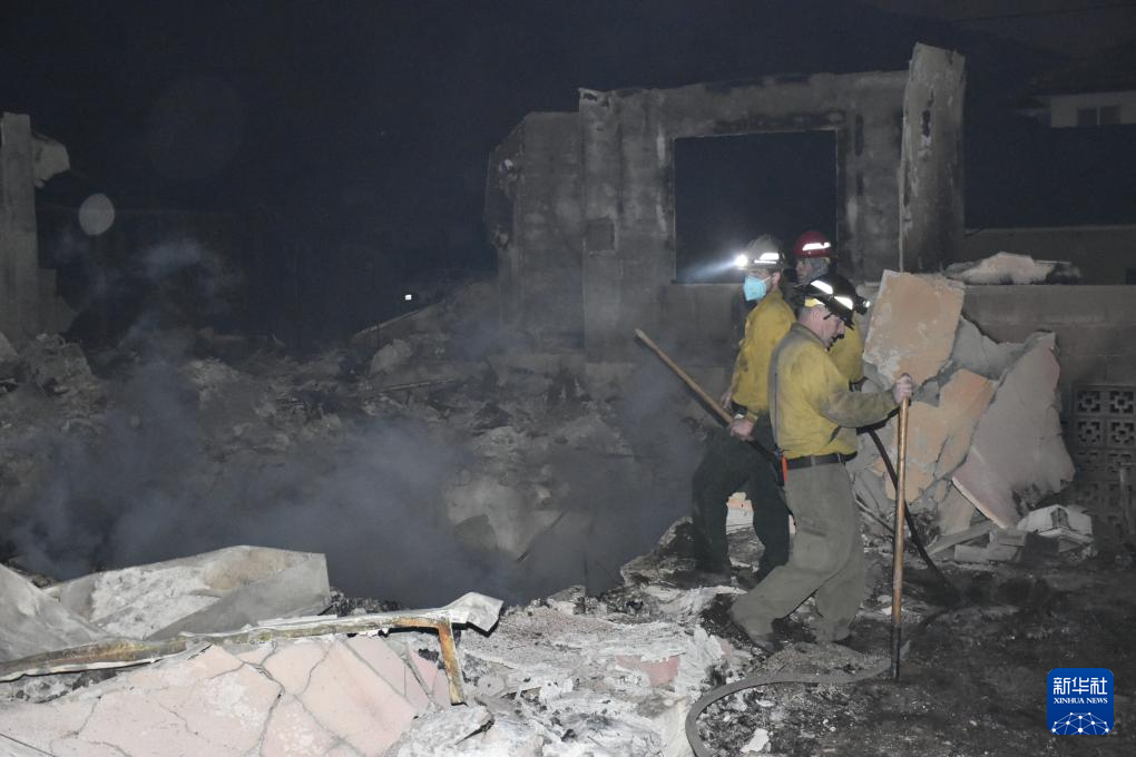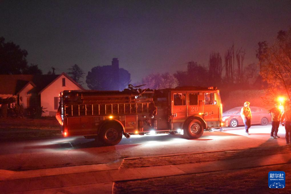 1月9日,消防員在美國加利福尼亞州洛杉磯縣東部的阿爾塔迪納地區工作。新華社發(高楚靈攝)
