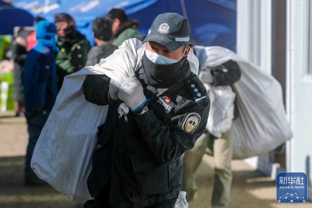 1月10日,在定日縣長所鄉古榮村,一名警察幫助受災羣眾將領到的物資從帳篷搬至板房。新華社記者 晉美多吉 攝