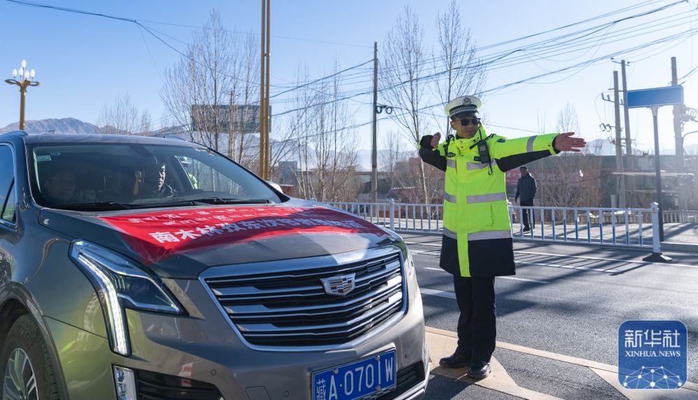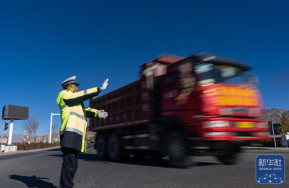 1月10日,在日喀則市區,交警邊巴次仁在指揮前往震中災區的救援車輛。新華社記者 丁增尼達 攝