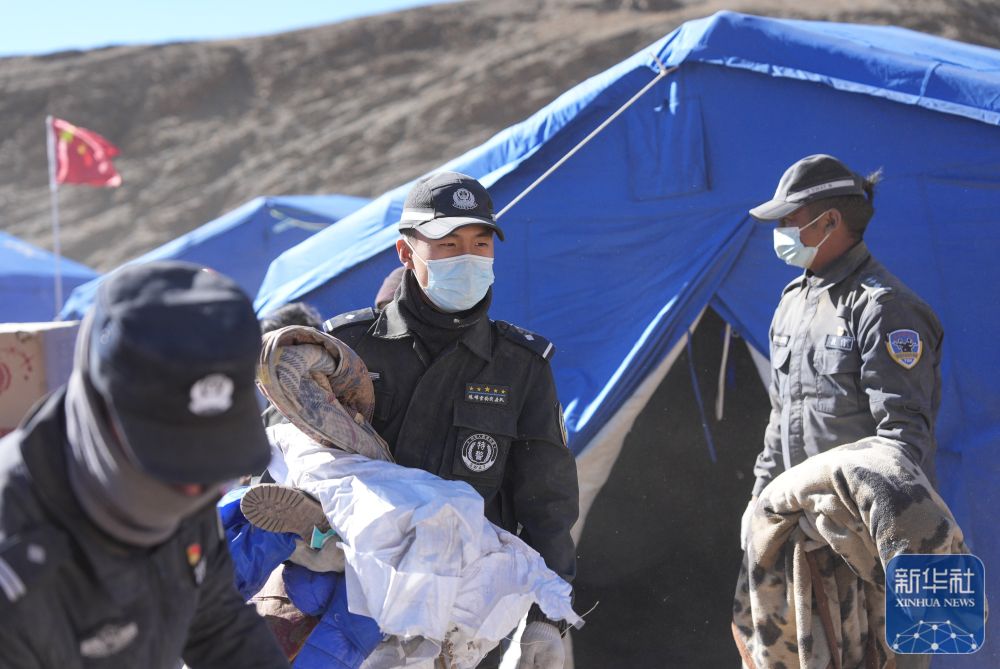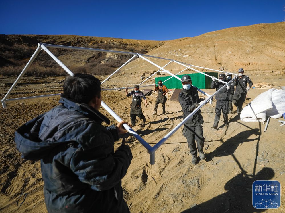 1月10日,在定日縣長所鄉古榮村,警察幫助搬入板房的受災羣眾收帳篷。新華社記者 沈伯韓 攝