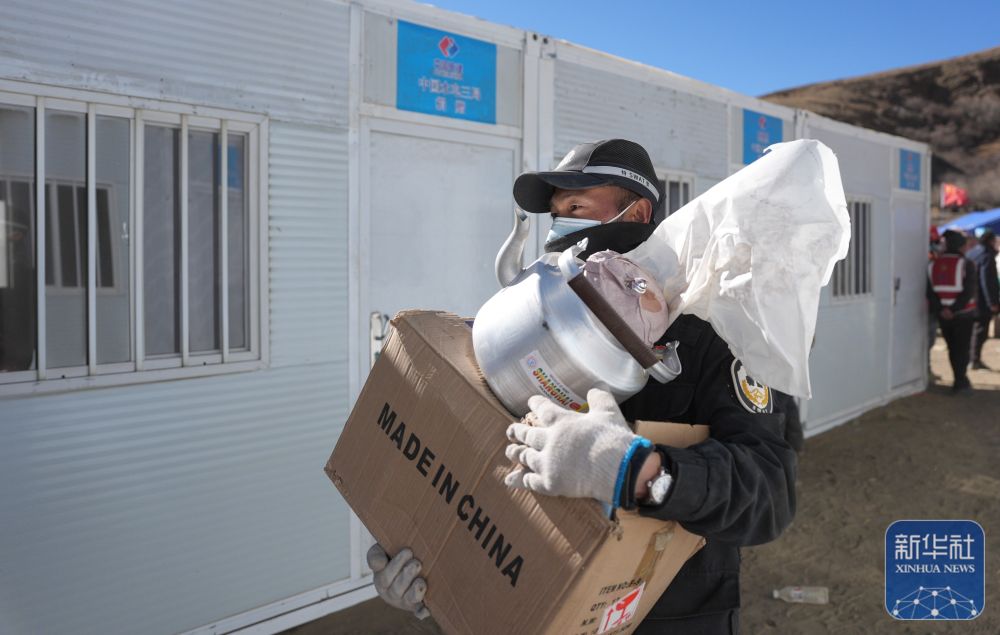 1月10日,在定日縣長所鄉古榮村,一名警察幫助受災羣眾將物品從帳篷搬至板房。新華社記者 沈伯韓 攝