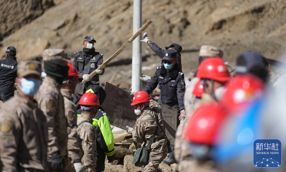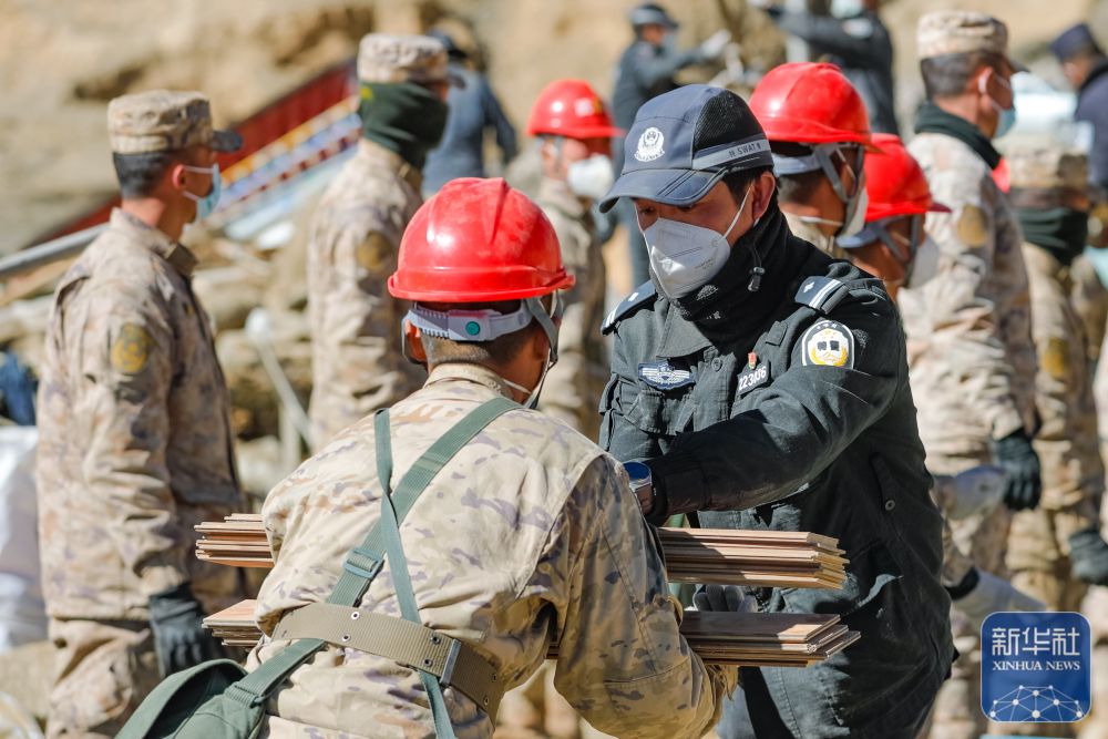 1月10日,在定日縣長所鄉古榮村,警察和各方救援力量一起清理廢墟。新華社記者 晉美多吉 攝