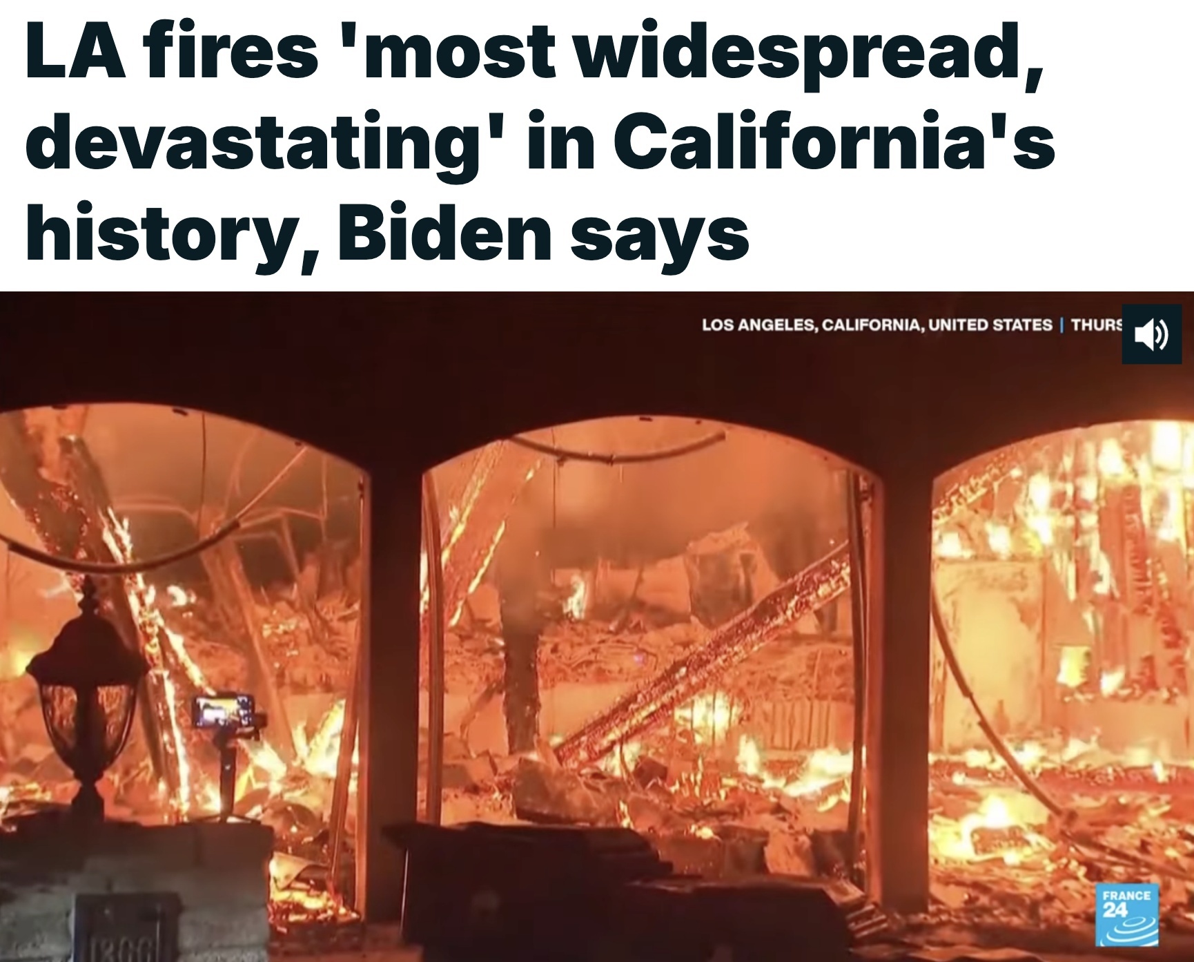 △法國24新聞台報道:美國總統拜登稱洛杉磯火災是加州歷史上“最廣泛、最具破壞性”的火災。