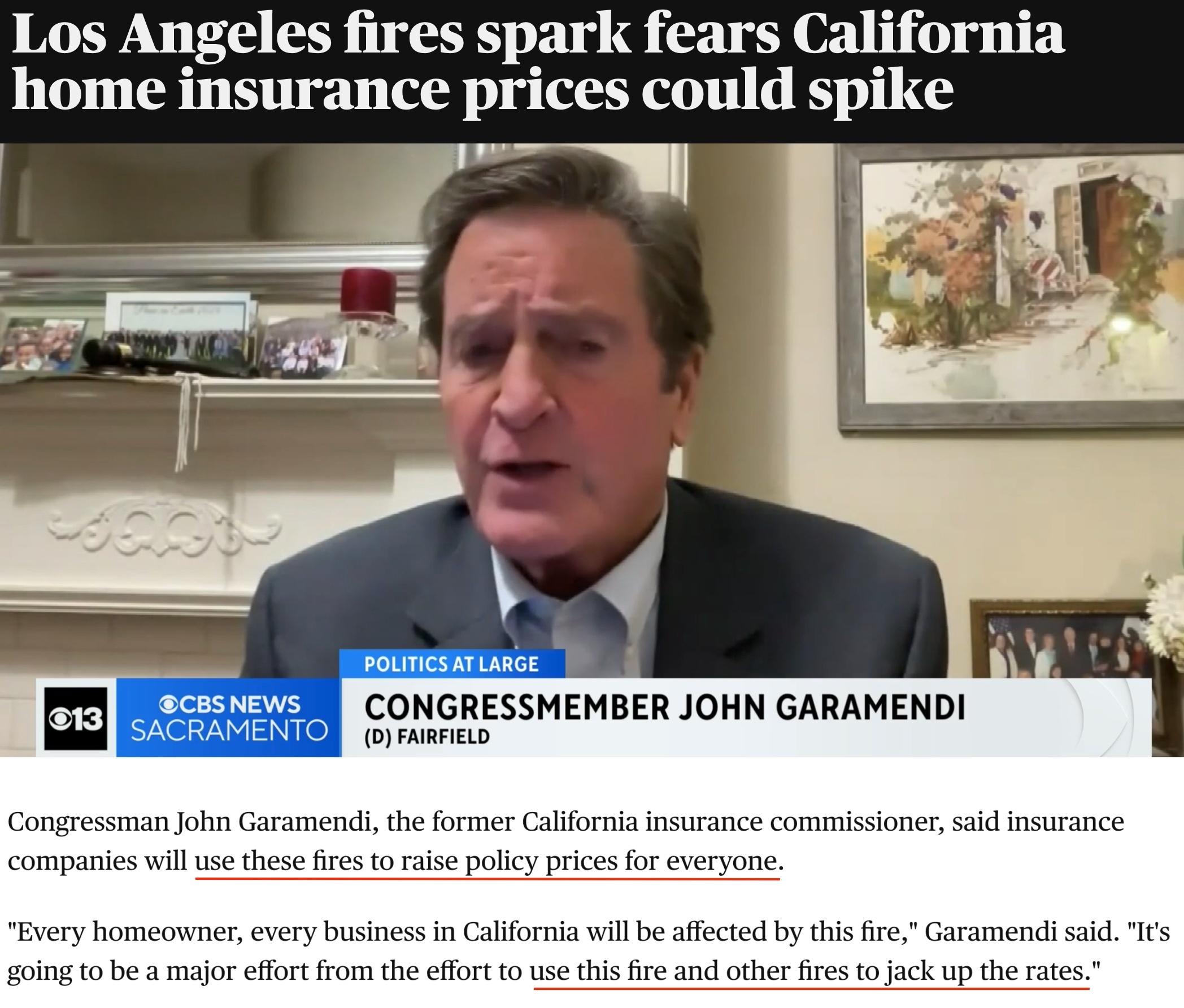 “加州的每個房主、每家企業都會受到這場大火的影響。保險公司將利用這場火災和其他火災來提高保費費率。”