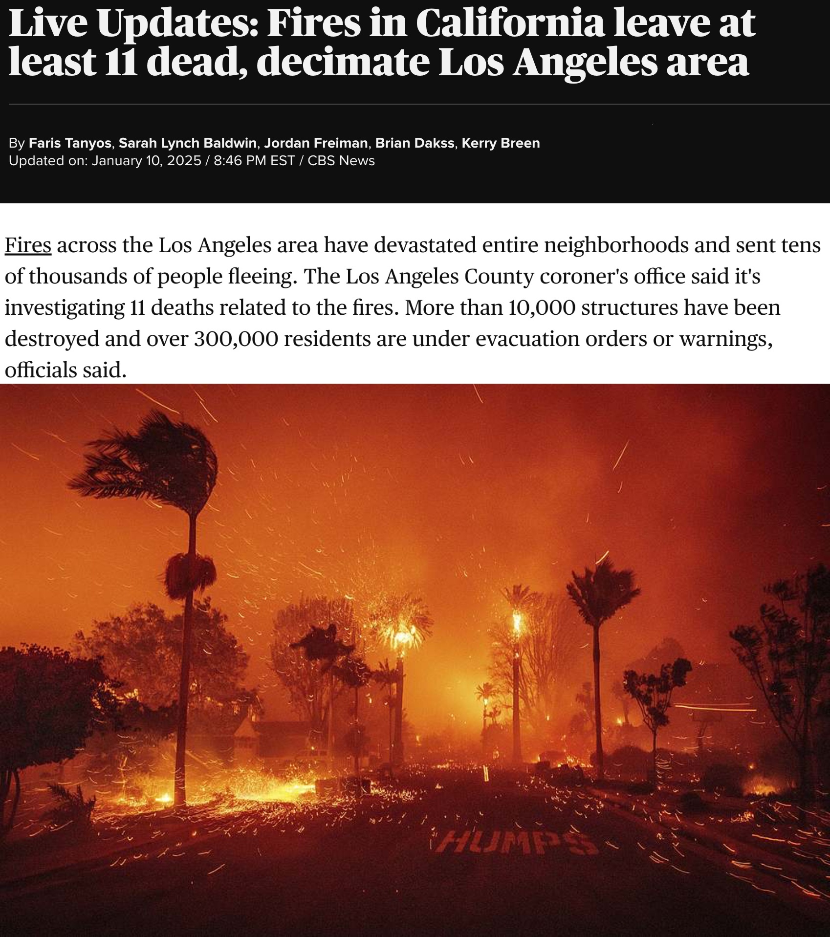 美國加利福尼亞州南部洛杉磯地區山火持續肆虐,截至當地時間10日已造成至少11人死亡,上萬棟建築物損毀,18萬人被迫撤離,30多萬居民收到撤離命令或警告。