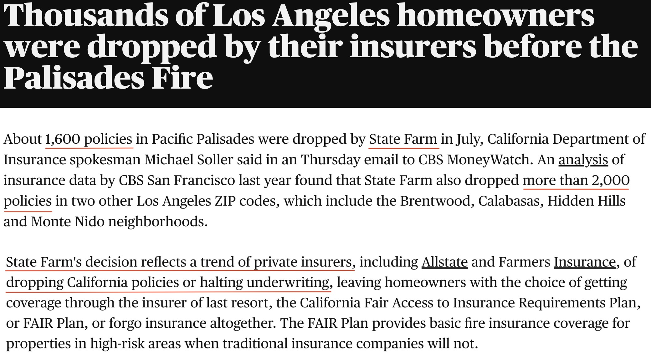 自2023年起,加州最大的保險公司——州立農業保險公司宣佈不再接受加州新房主的保險申請,並於2024年取消了72000份房屋保險,其中包括加州房產最貴的社區之一——帕利塞德的1600户房屋。一方面是因為該地的火災風險遠高於其他地區,另一方面則在於加州政策持續壓低其保險費率。