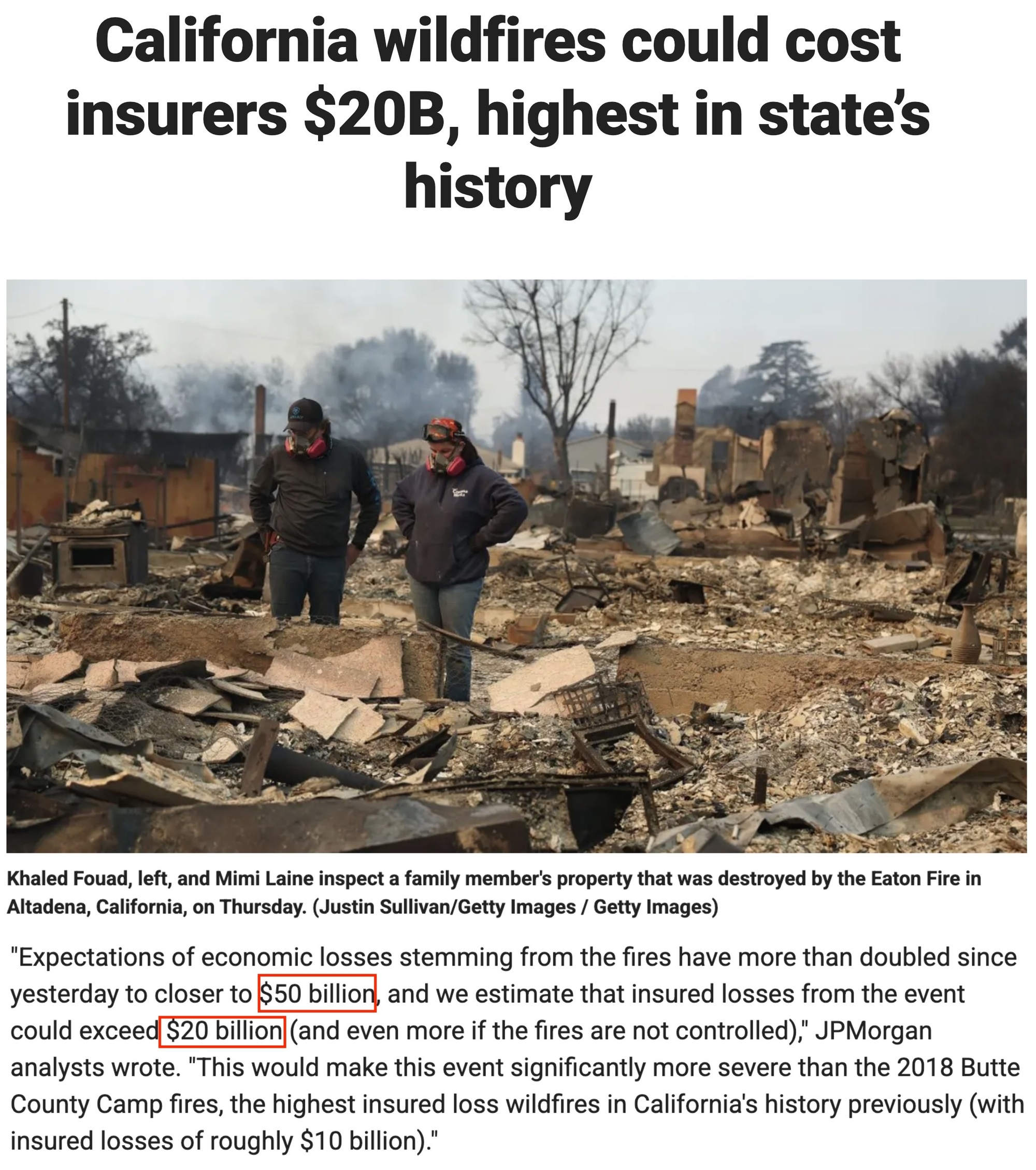 △福克斯商業新聞網站報道:摩根大通稱這次洛杉磯山火造成的保險損失將會超過2018年加州布特縣營地火災約100億美元的保險損失,成為加州歷史上保險損失最高的火災。