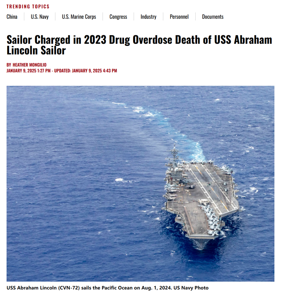 2023年,“亞伯拉罕·林肯”號航母上一名水兵外出度假時猝死,屍檢結果顯示該水兵死前曾過量吸毒。10天后,該艦另一名水兵也因吸食毒品過量被送院搶救。兩起案件引起了美國海軍犯罪調查局的關注。