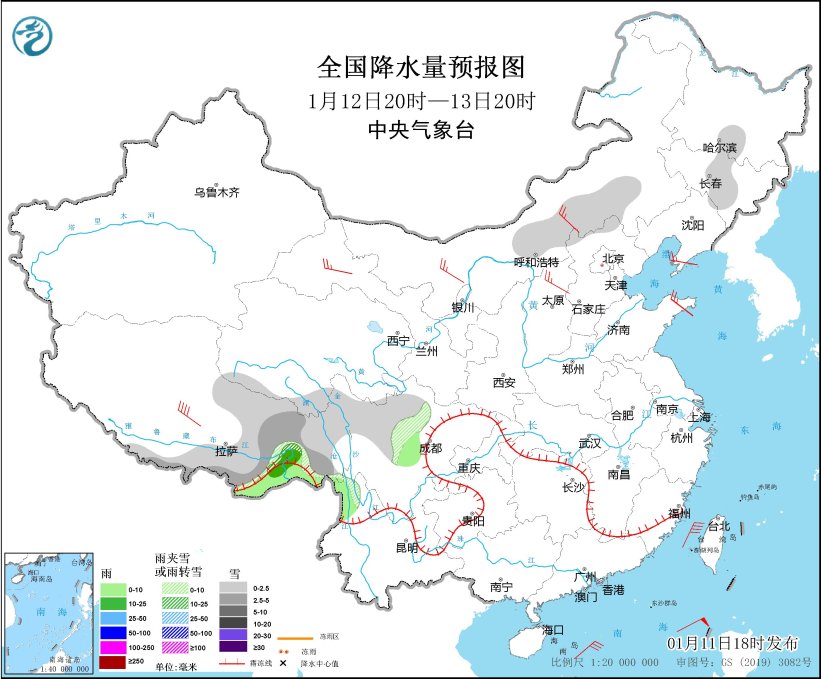 *1月12日20時至13日20時,*內蒙古中部和東南部、黑龍江南部、吉林中部、西藏東部和南部、川西高原北部等地部分地區有小到中雪或雨夾雪。西藏東南部、雲南西北部等地有小到中雨。甘肅河西、內蒙古中西部、山西北部等地部分地區有4~6級風。南海中北部和西南部海域、巴士海峽將有7~8級大風、陣風9~10級(見圖3)。