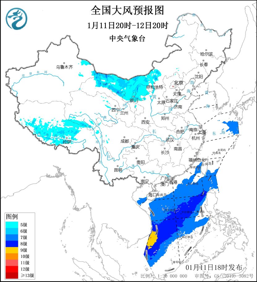 11日夜間至12日,受上一股冷空氣影響,預計,1月11日20時至12日20時,內蒙古西部、甘肅西北部、寧夏北部、陝西北部、西藏中東部、青海南部、川西高原等地部分地區有5~6級風,陣風7~8級;東海東北部海域、台灣海峽偏東海域、台灣東南洋麪、巴士海峽、南海大部海域、北部灣南部海域將有7~8級、陣風9級的大風,其中南海西南部部分海域的風力可達9級、陣風10級(見圖1)。中央氣象台1月11日18時繼續發佈大風藍色預警*。*