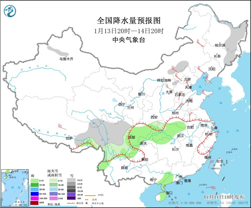 *1月13日20時至14日20時,*黑龍江北部和東部、吉林東部、西藏東部、川西高原等地部分地區有小雪或雨夾雪。四川盆地、湖北中西部、湖南北部、廣東西部、海南島中東部等地有小雨。內蒙古中東部、華北大部、黃淮大部等地部分地區有4~6級風。南海東北部和西南部海域、巴士海峽將有6~8級大風、陣風9級(見圖4)。