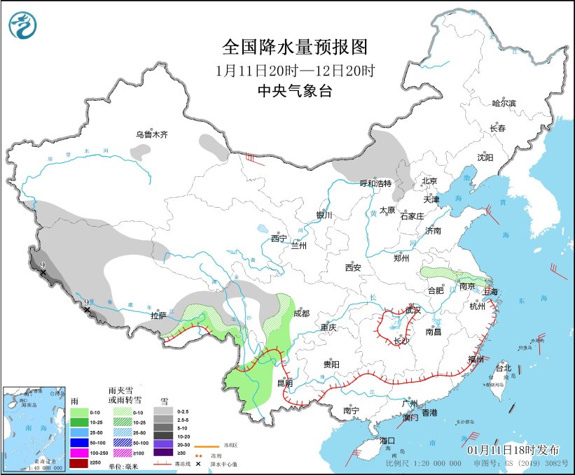 *1月11日20時至12日20時,*內蒙古中部、西藏西部和東部、安徽中北部、江蘇南部、川西高原北部等地部分地區有小雪或雨夾雪,其中,西藏西部和南部等地部分地區有中到大雪(5~9毫米),局地暴雪。西藏東南部、四川南部、雲南中西部等地部分地區有小雨。內蒙古西北部部分地區有6~7級風。內蒙古西部、甘肅西北部、寧夏北部、陝西北部、西藏中東部、青海南部、川西高原等地部分地區有5~6級風,陣風7~8級(見圖2)。