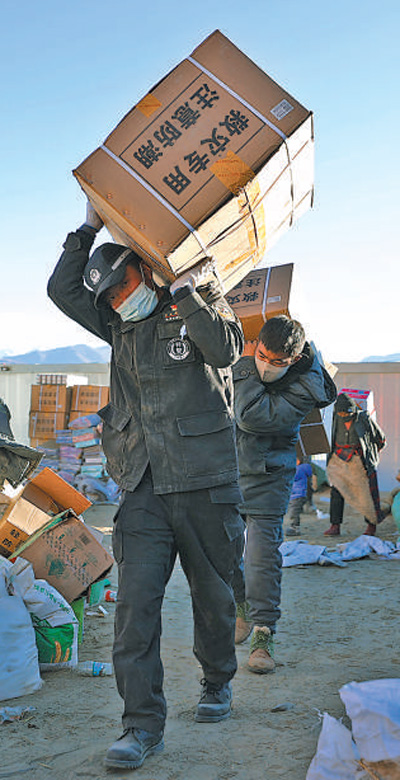 1月10日,日喀則市特警在古榮村安置點同受災羣眾一起搬運物資。