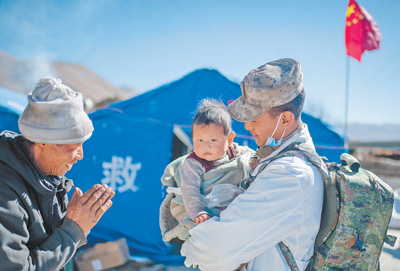 1月9日,在定日縣長所鄉古榮村安置點,受災羣眾感謝西藏軍區陸軍某部隊衞生員的醫療救治。