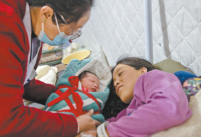 1月10日,日喀則市定日縣人民醫院婦產科醫生在照看一對母子。這名新生兒在9日剛剛出生。