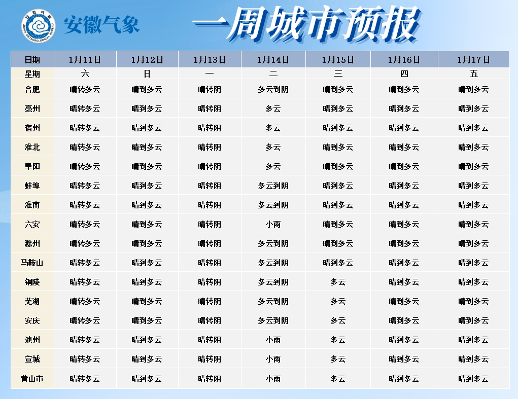 氣温: 11日至14日白天全省氣温逐漸回升,14日白天江南部分地區最高氣温16~18℃。14日傍晚至15日有一股較強冷空氣影響我省, 全省平均氣温將下降6~8℃,局部 下降 9~10℃ , 15日早晨淮北地區和16日早晨全省最低氣温- 7~-4℃ ;此外,14日傍晚至15日白天全省偏北風力增至3~4級,陣風7級左右。16-17日全省氣温逐漸回升。