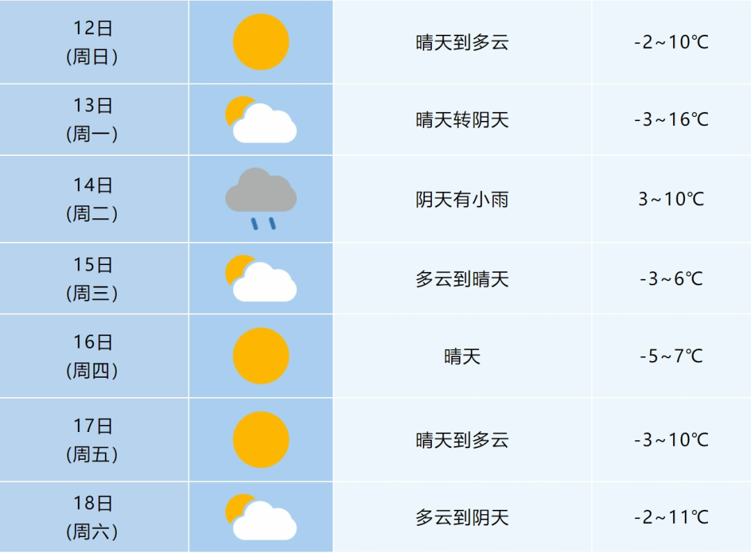 降水: 未來一週全省以多雲到晴天氣為主,僅14日淮河以南部分地區有弱降水。