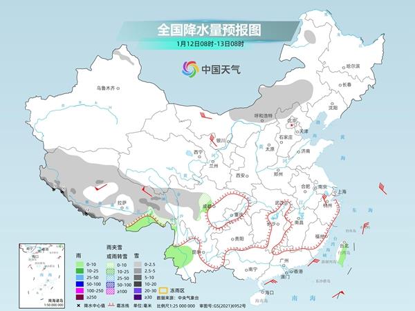 今後三天,我國雨雪天氣總體在發展增多,青藏高原至西南地區東部自西向東將有一次雨雪天氣過程。其中今天,內蒙古中部和東部、西藏大部、川西高原北部等地部分地區有小到中雪或雨夾雪,西藏南部和西部等地部分地區有中到大雪,局地暴雪。西藏東南部、四川盆地西南部、雲南中西部、台灣島東部等地部分地區有小雨。
