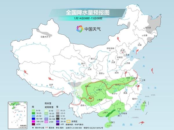 後天,內蒙古東北部、黑龍江中東部、吉林東部、新疆沿天山地區、西藏東北部、安徽南部、川西高原和四川南部等地部分地區有小雪或雨夾雪。安徽中南部、湖北大部、湖南北部和西部、貴州大部、四川南部、廣西東部、廣東大部、台灣島等地部分地區有小雨,其中,廣西東南部、廣東西部等地部分地區有中雨。
