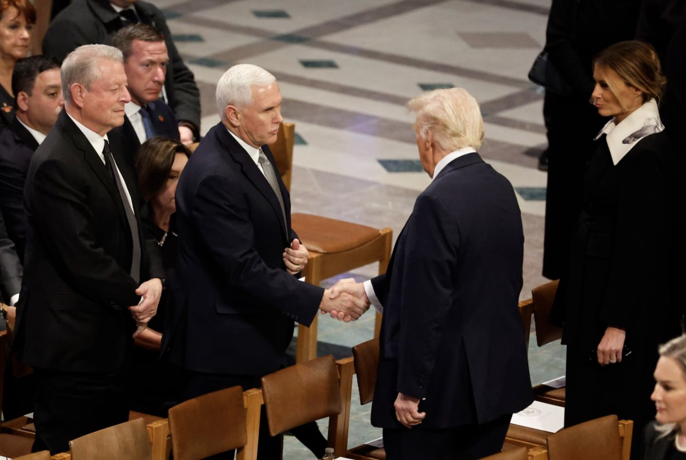 1月9日,彭斯與特朗普在美國首都華盛頓國家大教堂出席美國前總統吉米·卡特的國葬儀式時握手。圖源:美媒