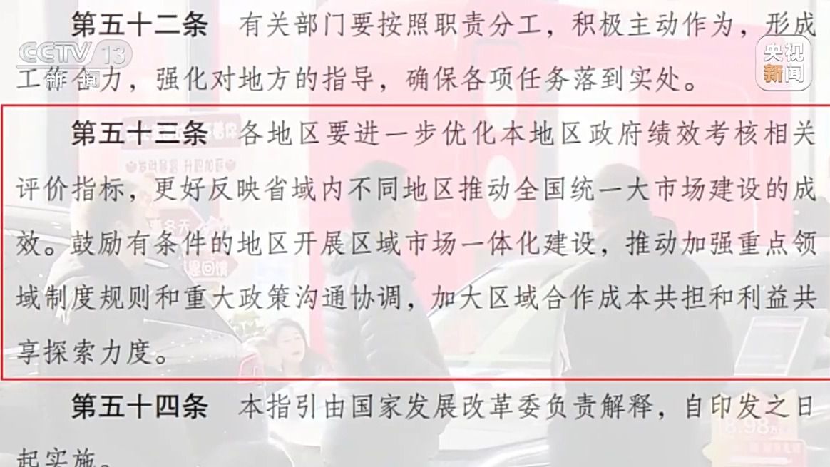 建設全國統一大市場,要求地方政府做到全國一盤棋,破除地方保護和市場分割。但人口和企業流動,會帶來經濟數據和税收的增與減,這也對地方政績考核標準提出了新的要求。為此《指引》提出,各地區要進一步優化本地區政府績效考核相關評價指標,更好反映省域內不同地區推動全國統一大市場建設的成效。