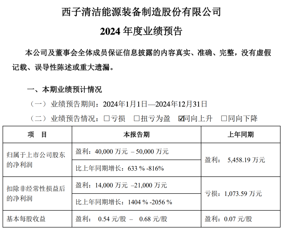 1月10日,西子潔能發佈2024年度業績預告,預計全年度淨利潤將同比增長633%至816%。這是目前業績預告中,預計淨利潤增幅最高的公司。西子潔能在公告中表示,淨利潤增長的原因主要包括訂單質量改善、銷售毛利率增長;公司加強銷售、管理和財務費用管控,三項費用支出較上年同期下降;公司預期信用損失和資產減值計提減少;2024年度公司轉讓參股公司股權等確認的投資收益增加。