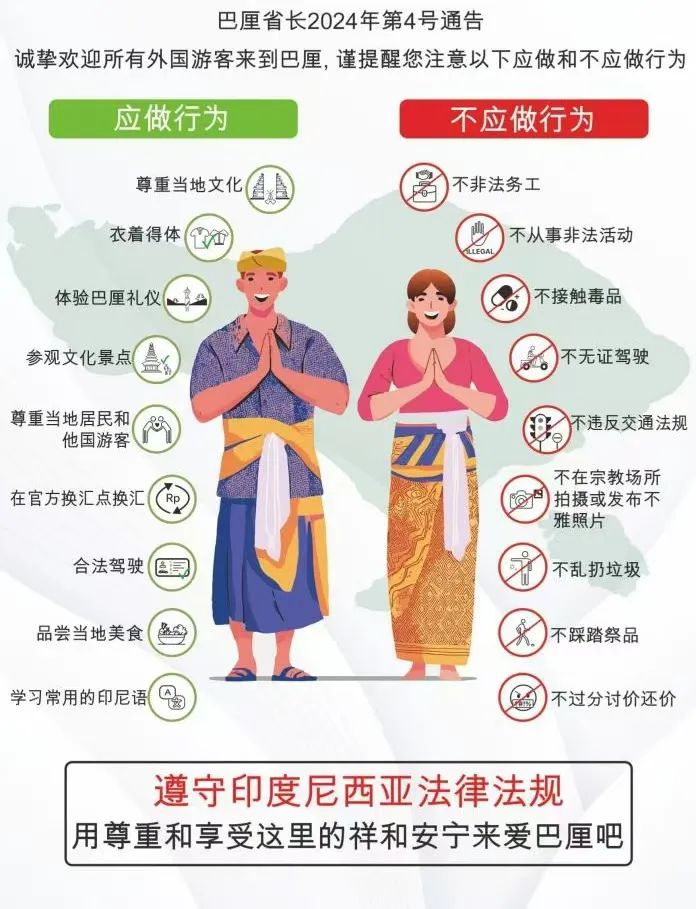 行前請確認護照有效期為6個月以上且無明顯破損,準備好巴厘島酒店訂單、返程機票備查,攜帶可境外使用的銀行卡。入出境時勿在機場入出境限制區域拍照、攝像、抽煙、插隊或其他不文明行為。建議提前購買境外旅遊人身安全保險。中國遊客(澳門特別行政區居民除外)可持落地簽證入境印尼,但不得從事與簽證類型不符的活動。