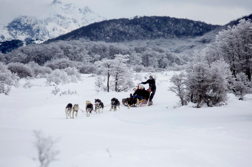 2018年7月8日,在阿根廷火地島首府烏斯懷亞,遊客體驗狗拉雪橇。在南美大陸最南端的烏斯懷亞距南極洲只有800公里。新華社發(馬丁·薩巴拉攝)