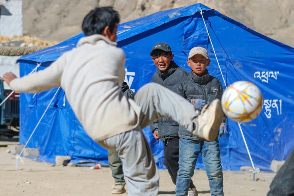 1月11日,在定日縣曲洛鄉措昂村,孩子們在臨時安置帳篷間的空地上踢足球。(新華社記者 沈伯韓 攝)